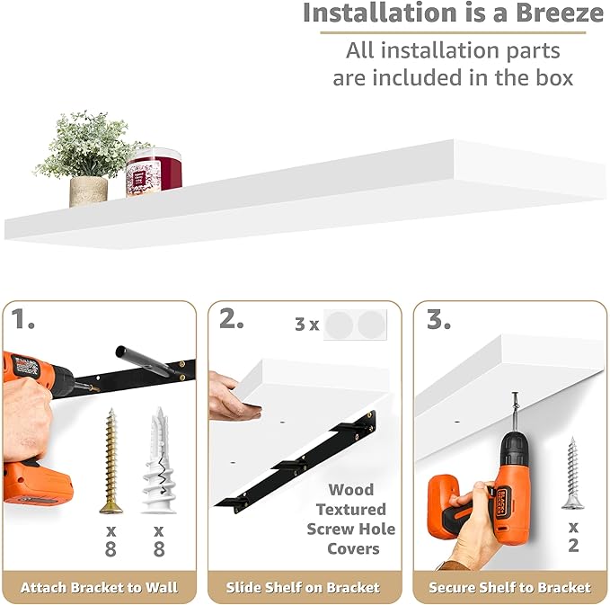 - Easy to Install: Minor assembly required, detailed instructions included. Hanging shelves are made of beautiful, engineered faux wood (not solid wood) with a smooth matte finish. Enhanced steel brackets attach firmly to the wall. Sturdy enough to hold up to 22 lbs. Mounting hardware INCLUDED. Color of bathroom shelf may be slightly different from the product photos due to lighting and screen settings