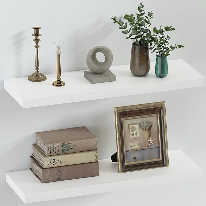 SAUMONIERES Floating Shelves 8 Inch Deep Solid Wood Wide Wall Shelf Set of 2 Wall Mounted for Bedroom Bathroom Living Room Kitchen, 24 Inch White