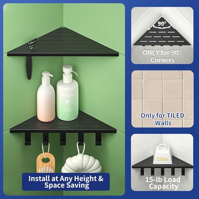- Corner-fitting Design: With a corner-fitting design, these shelves are meant to be installed by embedding them into the tile joints. This installation method not only provides stability but also adds an elegant touch to your bathroom decor.