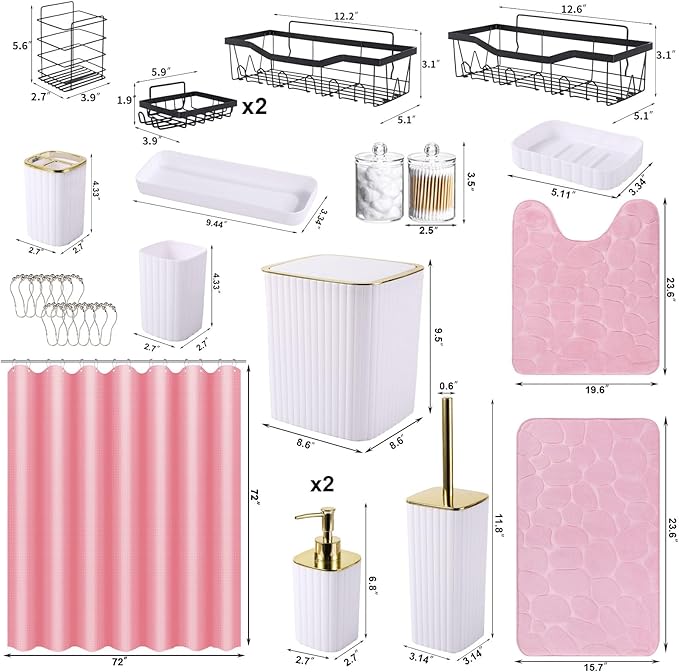 Bathroom Accessories Set - 30PC Gorgeous White Bathroom Set, Bathroom Accessory Set, Pink Shower Curtain Set with Shower Caddies, Soap Dish & Trash Can