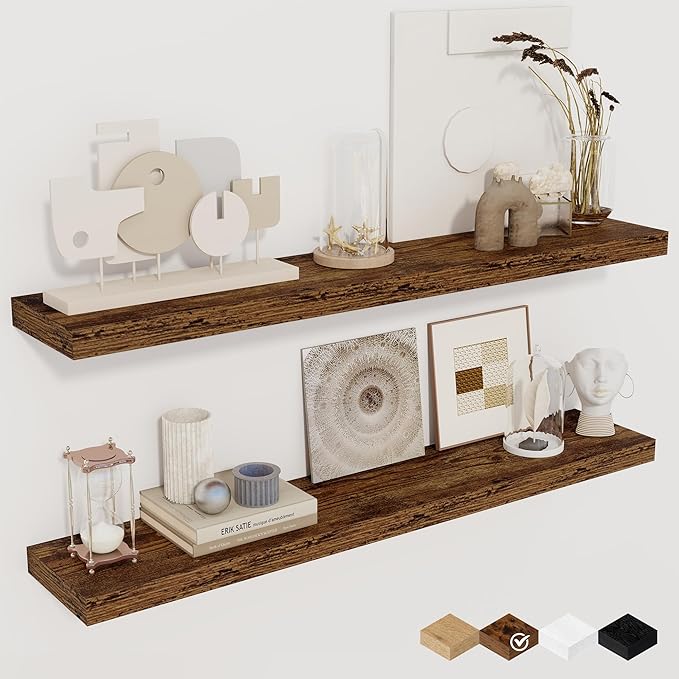 - EASY TO ASSEMBLE: Upgraded hidden mounting bracket aligns ensure a sleek floating effect, making the shelves secure. Instructions, a magnetic level, drywall anchors, and screws are included, making it easy to mount these rustic shelves gap-free in under 8 minutes