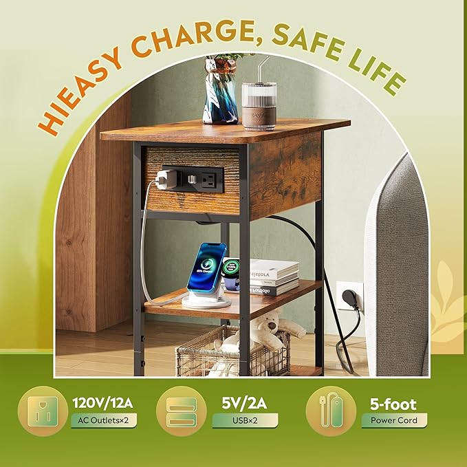 - 【Flip-Top Storange End Table】: The rustic narrow end table comes with a flip top drawer and 2 tier storage shelves offering ample space to storge and display . Small nightstand desktop fits well for magazines, bedtime books—creating clutter-free family moments every day.This small bedside table is great for living room, bedroom and some small spaces.