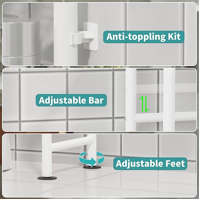 - CONSTRUCTIONAL STABILITY - With 3 open shelves, this above toilet storage rack provides plenty of space to store towels, toilet paper, toiletries and more. The included 4 no-punch anti-tip kits and 4 height-adjustable feet prevent the shelf from swaying and tipping, thus improving the overall stability of the bathroom shelf.