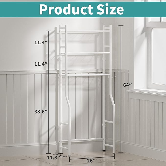 - SPACE SAVING - The over toilet storage shelf measures 26 inches long * 8.6 inches wide * 64 inches high and the bottom shelf is 39 inches off the ground, fits most standard toilets, effectively utilizes the vertical space above the toilet for additional storage, allowing you to say goodbye to clutter and limited bathroom space!