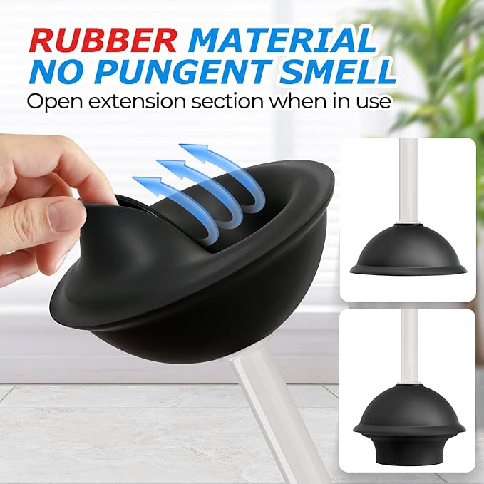 - ♦Extended handle -Heavy Duty Toilet Plunger: Compared to ordinary handles, our upgraded extended handle provides a better user experience and prevents stains from splashing onto the hands. A professional powerful suction cup that can solve various blockage problems. Comfortable handles provide greater support during use.