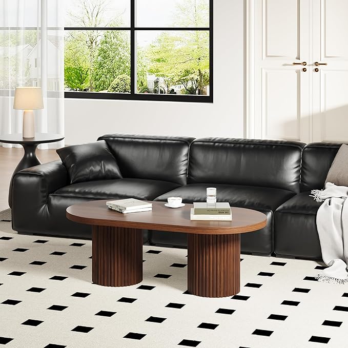 Oval Fluted Coffee Table, Farmhouse Wood Coffee Table Mid Century Modern Center Table Boho Living Room Tables for Living Room Office (Walnut, 19.69" D x 39.38" W x 13.78" H)