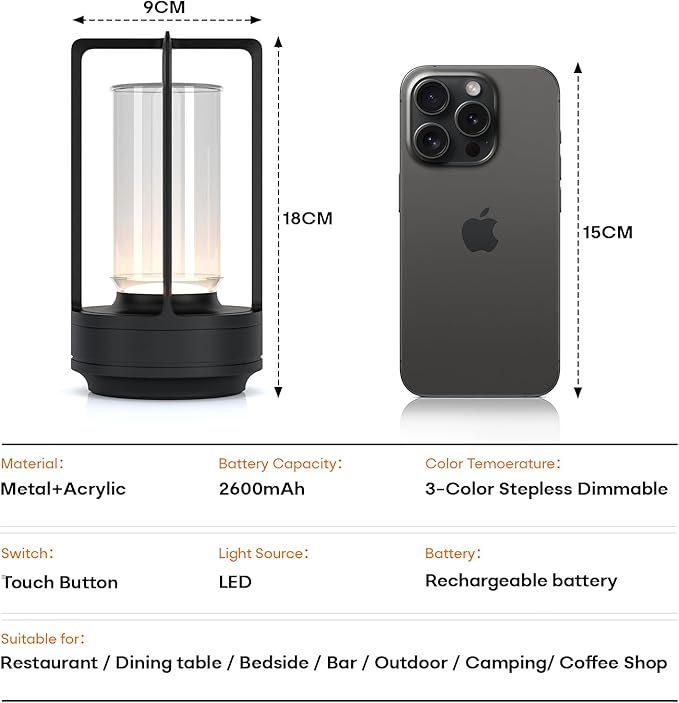 - 💚 [ A perfect gift idea ]: Our touch light lamp can match a variety of scenes and styles while making a great gift. It can be used as an ambient light for Thanksgiving, Christmas and birthday parties. The rechargeable cordless led table lamp is suitable for bedroom, bedside table, office, restaurant, cafe, bar, hotel, outdoor patio lighting, etc.
