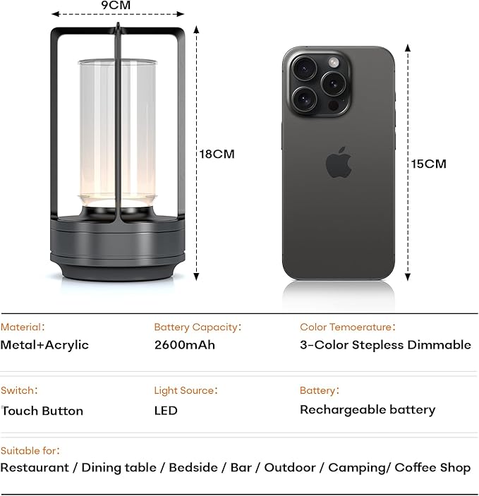 - 💚 [ A perfect gift idea ]: Our touch light lamp can match a variety of scenes and styles while making a great gift. It can be used as an ambient light for Thanksgiving, Christmas and birthday parties. The rechargeable cordless led table lamp is suitable for bedroom, bedside table, office, restaurant, cafe, bar, hotel, outdoor patio lighting, etc.