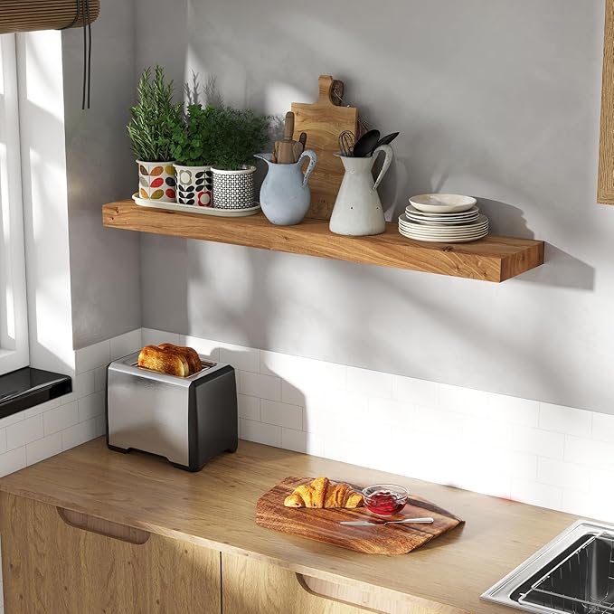- REAL SOLID ELM WOOD: These elegant elm wood floating shelves showcase the natural beauty of solid timber with a clean, minimalist design. The rich, warm tones and distinctive grain patterns of elm create organic visual interest, while the smooth, sanded surface offers a soft tactile feel.