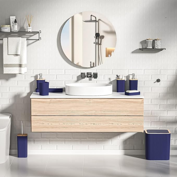 - BATHROOM ACCESSORIES SET: This 10PC navy blue bathroom set is made of durable plastic that can outlast other products. Item includes 2 x soap dispenser, 1 x toothbrush holder, 1 x bathroom tumbler, 1 x vanity tray, 1 x soap dish, 1 x toilet brush, 1 x trash can, 2 x plastic jars. Our high quality plastic bath accessories will resist to constant use.