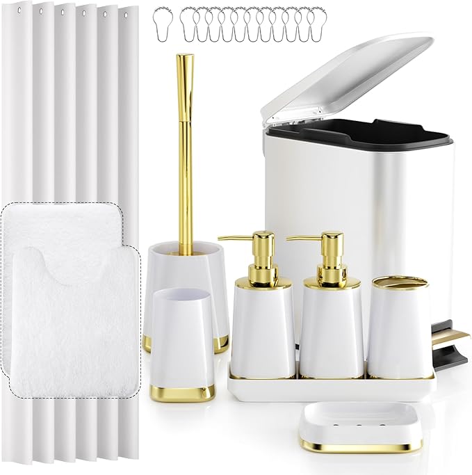 - Bathroom Sets with Shower Curtain and Rugs: A complete bathroom set includes 2*soap dispenser, 1*stainless steel bathroom trash can, 1*toilet brush, 1*toothbrush holder, 1*bathroom tumbler, 1*vanity tray, 1*soap dish, 1*white shower curtain, 2*bathroom rugs,12*hooks. Our bathroom sets with shower curtain and rugs meet all kinds of various you need.