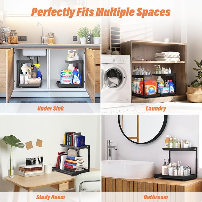 - Pull-Out Design for Easy Access: Designed as a 2-tier under counter storage organizer, this unit glides smoothly to give you fast access to everything inside. Ideal for an under kitchen sink organizers and storage or under sink bathroom organizers and storage, it eliminates the need to bend or reach blindly. Keep your cleaning supplies, toiletries, or bottles organized in under cabinet organizer