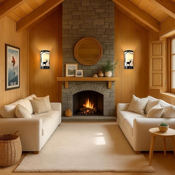 - Rustic Design: Farmhouse wall sconces set of two is crafted from durable matte black metal,featuring intricate forest elements and a deer silhouette,white parchment paper adds a soft,warm glow,enhancing industrial aesthetic of the vintage wall sconce