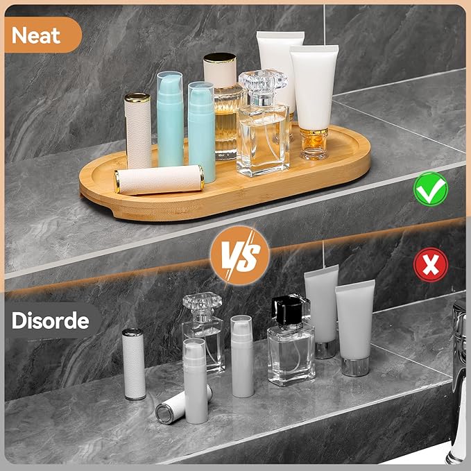 - 【Premium Bamboo with Lacquer Finish】 Made from natural bamboo and finished with a smooth, water-resistant lacquer, this vanity tray is durable, easy to clean, and perfect for daily use in humid environments like bathrooms and kitchens