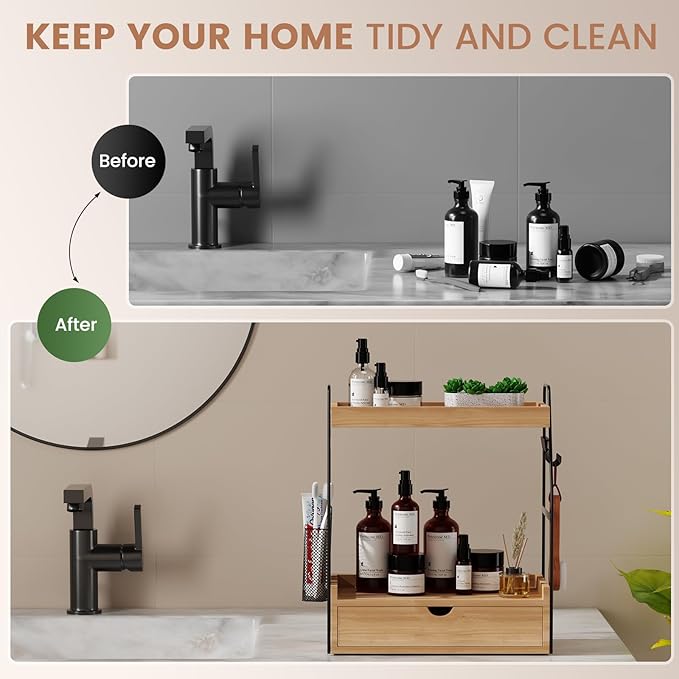 - MULTI-FUNCTIONAL STORAGE DESIGN: Tired of your messy bathroom counter? The Agotglmi bathroom counter organizer maximizes vertical space with its two-tier open shelf design, perfect for storing skincare products, perfumes and other essentials. Bathroom shelf features a built-in drawer for small items like jewelry, plus includes a basket and hooks to organize toothbrushes, makeup brushes and combs.