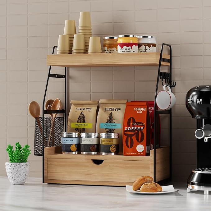 2 Tier Bathroom Counter Organizer with Drawer & Basket, Wooden Vanity Tray Countertop Shelf Accessories for Makeup Storage, Coffee Bar Station, Perfume Skincare, Kitchen, Bedroom (Brown)
