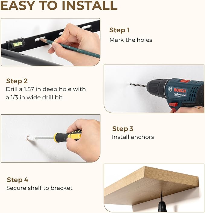 - Sturdy & Secure design: These 48-inch floating shelves feature a durable, concealed mounting bracket that offers reliable support for your belongings. Engineered for hassle-free and stable installation, each shelf includes all the required hardware to ensure a strong, wobble-free hold—perfect for showcasing your favorite decor, photos, or everyday items with confidence and style.