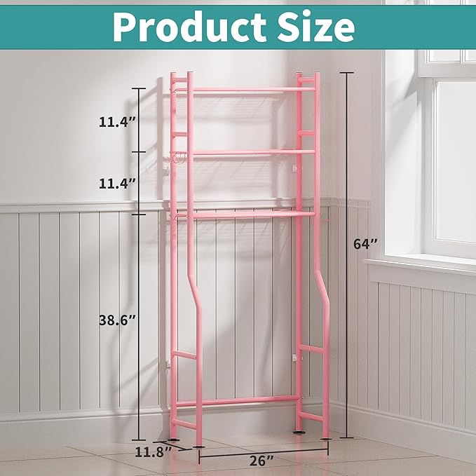 3-Tier Over The Toilet Storage with Paper Holder, Metal Bathroom Organizers and Storage for Small Space, Freestanding Bathroom Shelves with 4 Hooks, Above The Toilet Storage Shelf, Pink