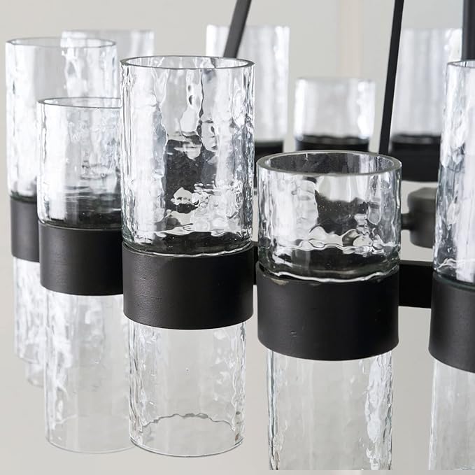 Round Black Glass Wagon Wheel Chandelier, Chandelier with Water Ripple Textured Recycled Clear Glass Piece, Modern Industrial Pendant Light with Metal Frame, Lighting Fixture for Living Room, Foyer