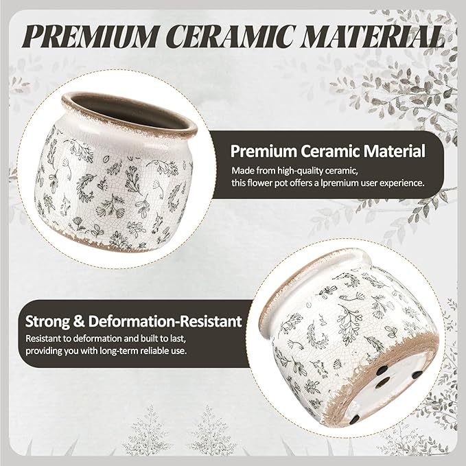 - Vintage Floral Design with Crackle Glaze: featuring a delicate wildflower pattern in soft green and beige tones, this ceramic plant pot adds a rustic, vintage charm to any space; The elegant crackle glaze finish enhances its artistic appeal, making it a beautiful decorative accent for home, office, or garden settings