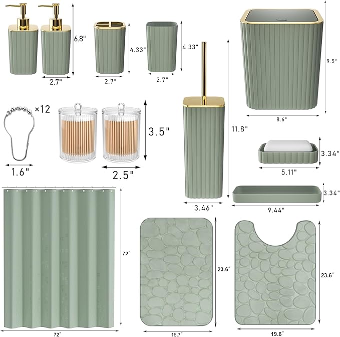 - BATHROOM ACCESSORIES SET: This 25-Piece Bathroom accessory set is made of durable plastic that can outlast other products. Sage green bathroom accessories includes 2 x soap dispenser, 1 x toothbrush holder, 1 x bathroom tumbler, 1 x vanity tray, 1 x soap dish, 1 x toilet brush, 1 x trash can, 2 x plastic jars, 12 x hooks, 1 x shower curtain and 2 x rugs. Our high quality bathroom sets with rugs and accessories will resist to constant use.