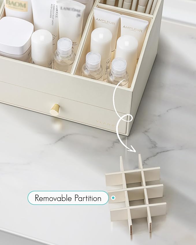 Vlando Makeup Organzier,Vanity Organizer with Drawers, PU Leather Skincare Organizer Perfume Organizer,Large Cosmetic Display Case for Lipstick,Brushes Gifts for Women-Beige