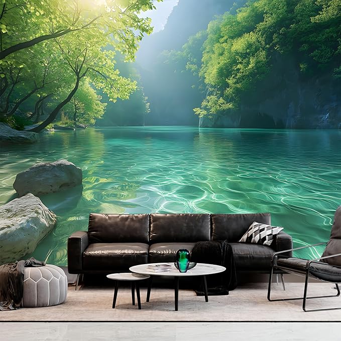 BSFHH Nature Tapestry Forest Tree Sea Cave Wall Hanging, Stream Through Rainforest Landscape Wall Art Tapestry for Bedroom Living room (Lake View, 110" × 87", Unframed)