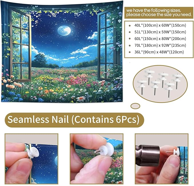 LB Wildflower Moon Tapestry, Green Plant Outside Window and Colorful Floral Wall Tapestry for Bedroom, Garden Wall Art for Living Room Dorm Home Decor Ready to Hanging, 80 x 60 Inches