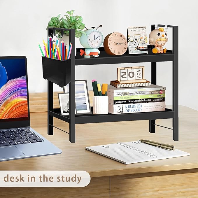 Bathroom Counter Organizer with Basket & Hooks, 2 Tier Bathroom Organizers and Storage for Perfume, Cologne or Spice, Black Countertop Organizer for Vanity, Kitchen, Office or Under Sinks