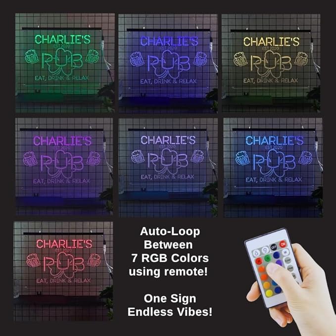 - Wide range of customizable bar signs for every space and mood. Choose from 1 or 2 color personalized neon bar signs, perfect for any custom pub sign or personalized beer sign. Available in 6 LED colors—blue, green, yellow, red, pink, and white. Each sign supports up to 2 colors, letting you personalize your home bar with the perfect mix.