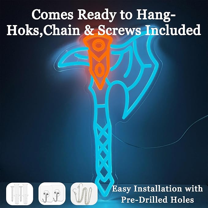- MINUTES-TO-MOUNT: Pre-drilled holes with chain, hooks, and wall hardware make hanging straightforward; works as man cave decor led axe sign or a subtle room accent led axe sign above consoles, couches, or bar shelves