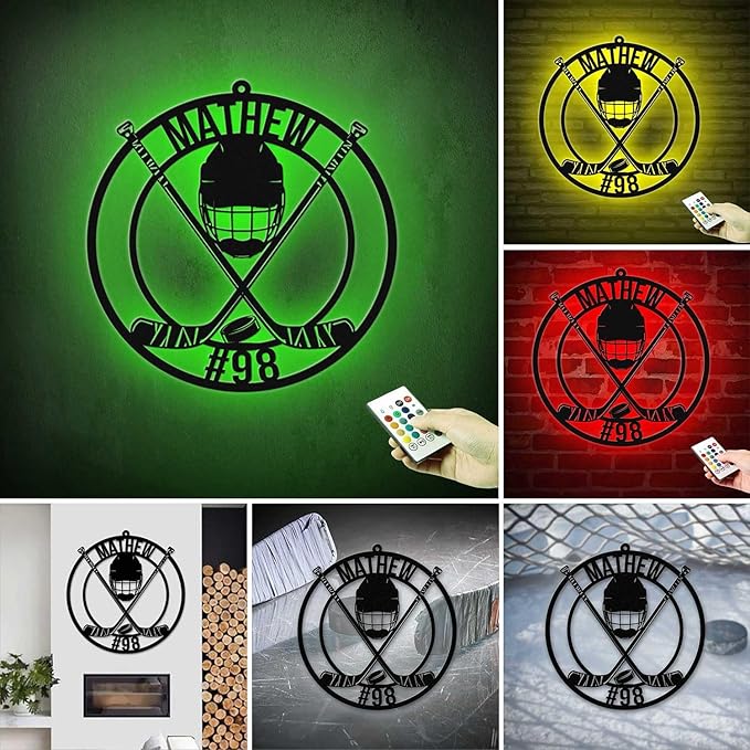 - [Easy Install Hockey Decor]: This custom light up sign includes pre-attached hooks for simple hanging. LED strips highlight the cutout hockey design, creating stylish metal art wall decor, hockey signs, and hockey decor. Great best gifts for hockey players, sports fans, and unique personalized sign gifts.
