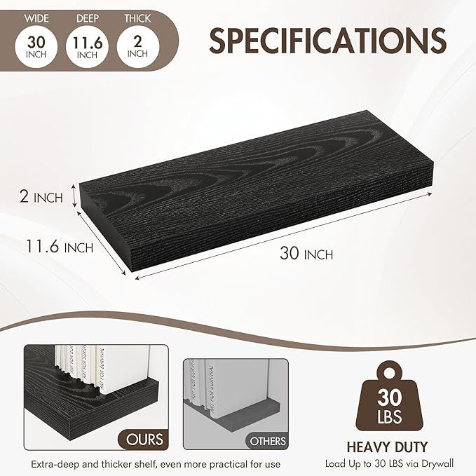 30 Inch Floating Shelves, 12" Deep Floating Shelf Wall Mounted, 30" Wall Shelves, Rustic Deep Bookshelf, Extra Deeper & Thicker Display Shelves for Bedroom, Living Room, Black, Set of 2