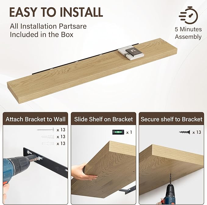 - [EFFORTLESS INSTALLATION] Each set comes with all necessary hardware and a clear, step-by-step guide for quick mounting. Transform your walls in minutes—no special tools required. Whether you're a DIY beginner or a seasoned decorator, these shelves make upgrading your space simple and hassle-free.