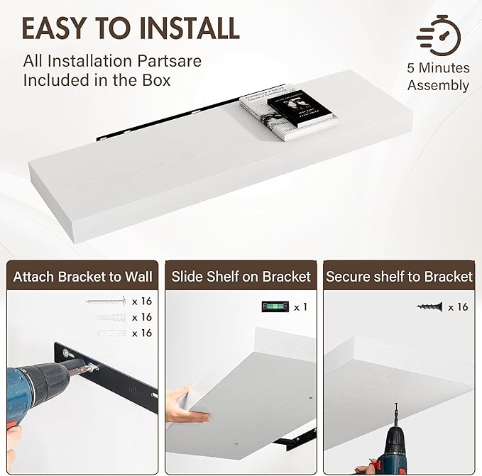 - [EFFORTLESS INSTALLATION] Each set comes with all necessary hardware and a clear, step-by-step guide for quick mounting. Transform your walls in minutes—no special tools required. Whether you're a DIY beginner or a seasoned decorator, these shelves make upgrading your space simple and hassle-free.
