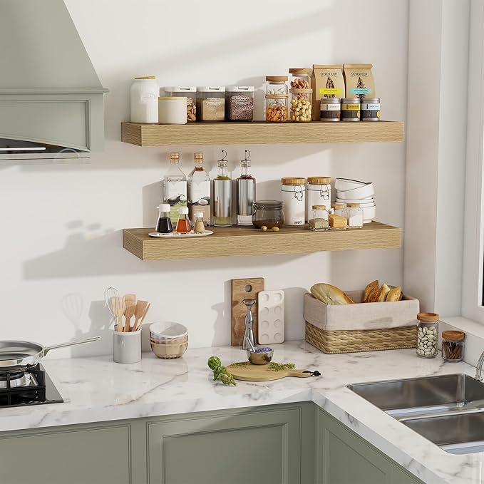 - [SPACE-SAVING WALL SOLUTION] Ideal for maximizing small rooms, kitchens, or cozy apartments, these shelves create storage without cluttering floors. Their floating design opens up living areas, making spaces feel airy and well-organized. Use them in entryways, bathrooms, or home offices to keep daily essentials neatly displayed yet within easy reach.