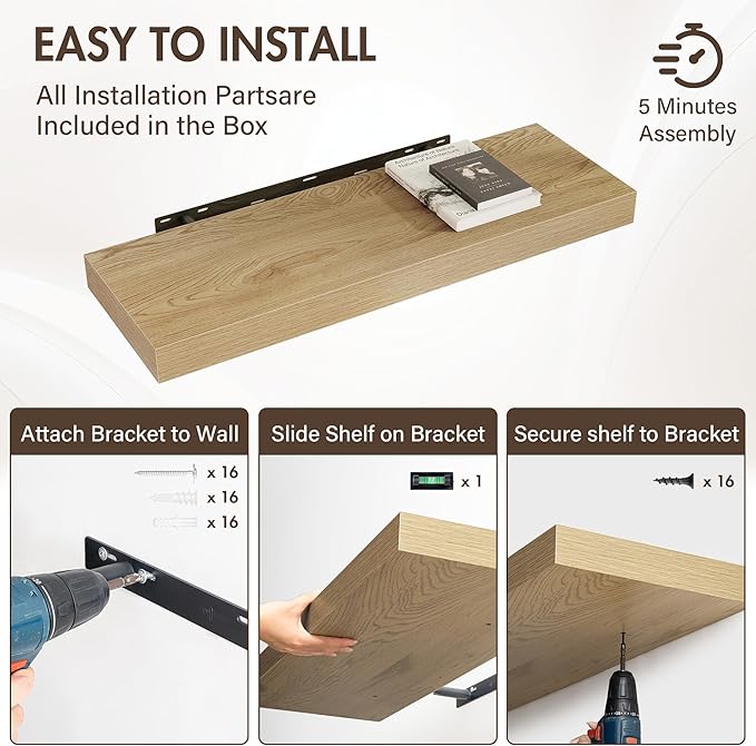 - [EFFORTLESS INSTALLATION] Each set comes with all necessary hardware and a clear, step-by-step guide for quick mounting. Transform your walls in minutes—no special tools required. Whether you're a DIY beginner or a seasoned decorator, these shelves make upgrading your space simple and hassle-free.