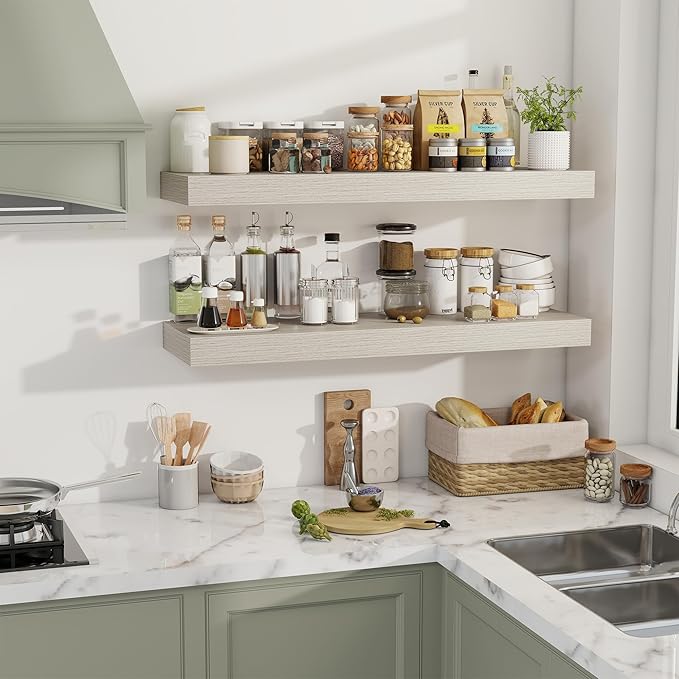 - [SPACE-SAVING WALL SOLUTION] Ideal for maximizing small rooms, kitchens, or cozy apartments, these shelves create storage without cluttering floors. Their floating design opens up living areas, making spaces feel airy and well-organized. Use them in entryways, bathrooms, or home offices to keep daily essentials neatly displayed yet within easy reach.