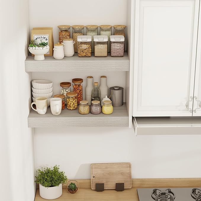 - [SPACE-SAVING WALL SOLUTION] Ideal for maximizing small rooms, kitchens, or cozy apartments, these shelves create storage without cluttering floors. Their floating design opens up living areas, making spaces feel airy and well-organized. Use them in entryways, bathrooms, or home offices to keep daily essentials neatly displayed yet within easy reach.