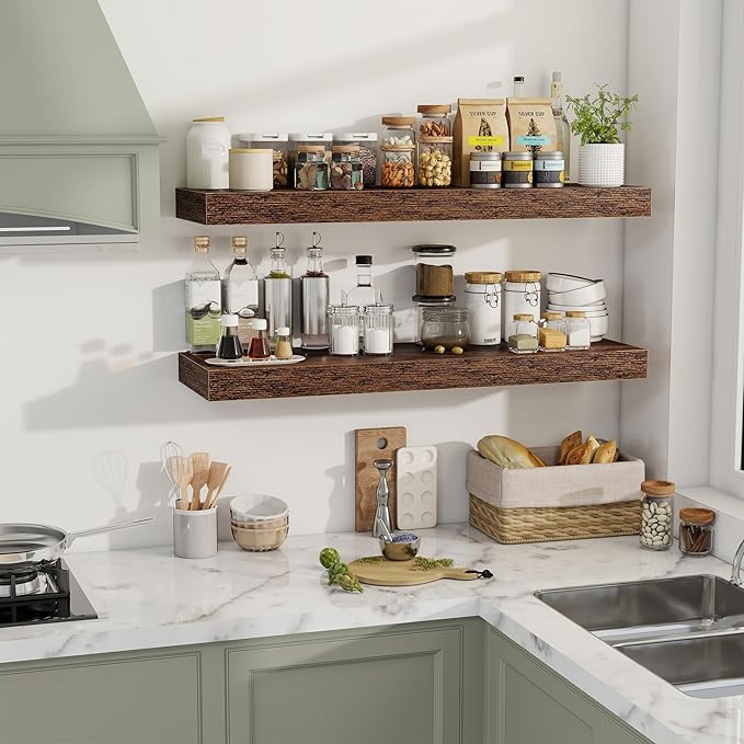 - [GENEROUS DISPLAY & STORAGE] With an expansive 12-inch depth, these floating shelves offer abundant room for books, kitchen essentials, decorative accents, and more. The extra-wide surface accommodates larger items like potted plants, baskets, or framed art, while the 2-inch thick design ensures sturdy support. Perfect for organizing and showcasing your favorite pieces without compromising on style or functionality.