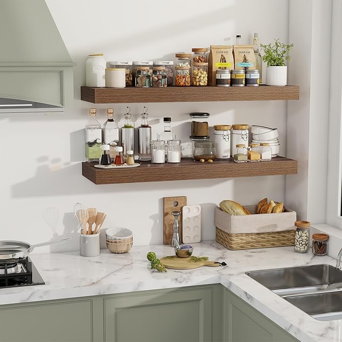 - [SPACE-SAVING WALL SOLUTION] Ideal for maximizing small rooms, kitchens, or cozy apartments, these shelves create storage without cluttering floors. Their floating design opens up living areas, making spaces feel airy and well-organized. Use them in entryways, bathrooms, or home offices to keep daily essentials neatly displayed yet within easy reach.