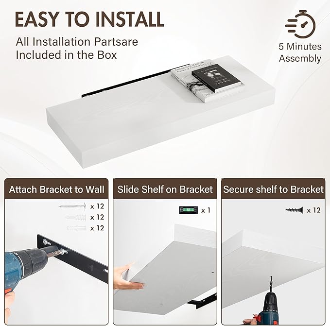 - [EFFORTLESS INSTALLATION] Each set comes with all necessary hardware and a clear, step-by-step guide for quick mounting. Transform your walls in minutes—no special tools required. Whether you're a DIY beginner or a seasoned decorator, these shelves make upgrading your space simple and hassle-free.