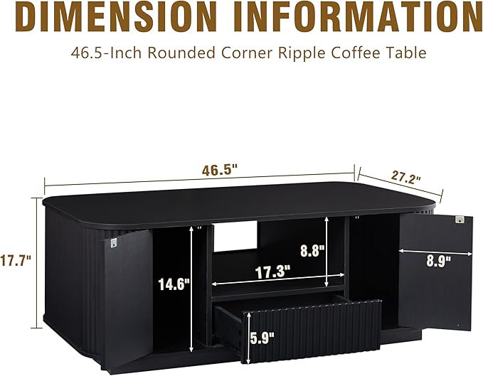 46.5" Oval Coffee Table with Drawers and Storage Mid Century Modern Fluted Solid Wood Side Coffee Tables, Luxury Tea Table Center Table for Living Rooms Offices Apartmen, Black