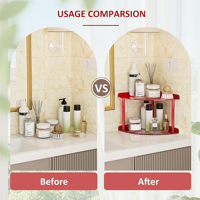 - Space Saver: The countertop organzier corner shelf rack is a perfect space saver in your house. 2 tier design will help you to organize your toiletries, cosmetics, skincare, perfume or spice jars very well. You will get a very tidy counter. Say goodbye to mess!