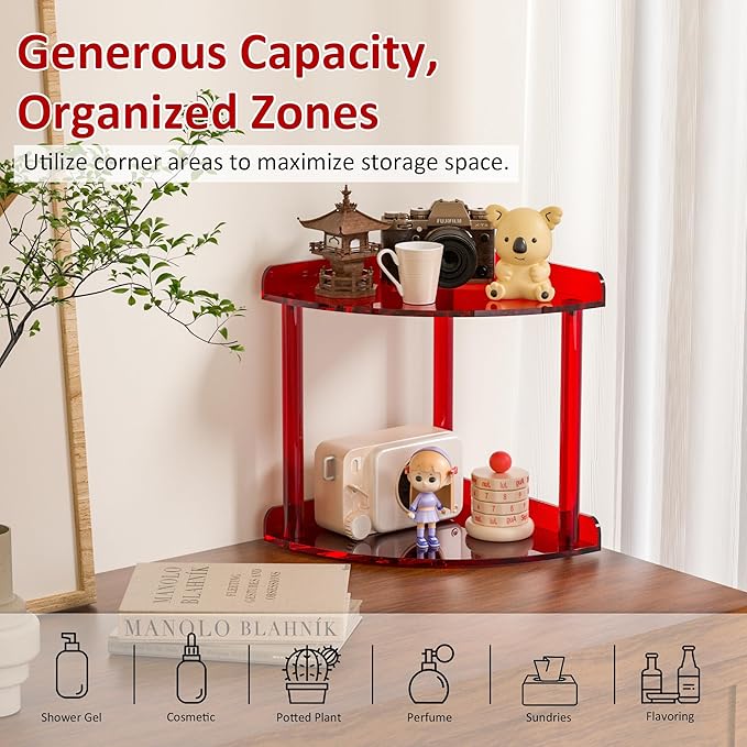 2 Tier Countertop Corner Organizer Shelf 7x7x8 Inch, Red Acrylic Bathroom Corner Shelf for Countertop, Vanity Storage for Skincare, Cosmetics, Perfume