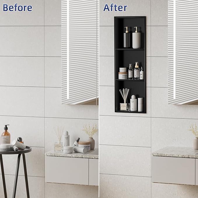 - 【Effortless No-Tile Installation】 Simply place this recessed niche into your pre-cut wall opening (36.2"L x 12.2"W x 4.3"D) and secure edges with silicone adhesive. No tiling required—saving installation time and costs while delivering a sleek, built-in look.