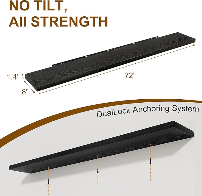 72 Inch Floating Shelves 2 Pack, 8 Inch Deep Floating Shelf Wall Mounted, Large Shelves with Invisible Bracket for Books|Storage, Rustic Wood Wall Shelf for Bedroom, Kitchen, Living Room, Black