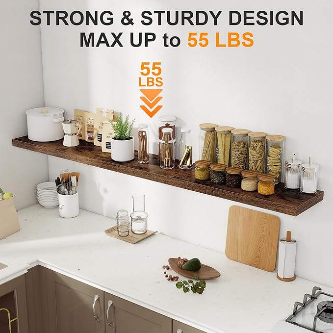 - 【FARMHOUSE RUSTIC WALL SHELF】These floating shelves are made of premium engineered wood board and invisible one-piece bracket. The rustic wooden grain surface add character and warmth to any modern or traditional interior with these thick floating shelves, contrast shelves at staggering heights on the wall or mount side-by-side or in the corner for a clean streamlined look.