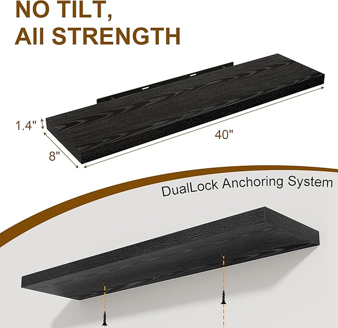 40 Inch Floating Shelves Set of 2, 8 Inch Deep Wall Shelf, Rustic Wood Storage Shelves for Bedroom, Kitchen, Bathroom, Wall-Mounted Shelf with Invisible Brackets for Books|Storage Black