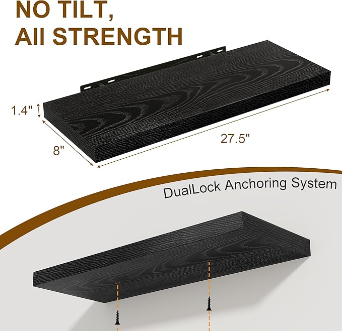 Black Floating Shelves for Wall, 27.5 Inch Bathroom Shelves Set of 2, Rustic Wood Wall Shelf with Invisible Brackets for Books|Storage|Decor, 8 Inch Deep Floating Shelf for Bedroom|Kitchen